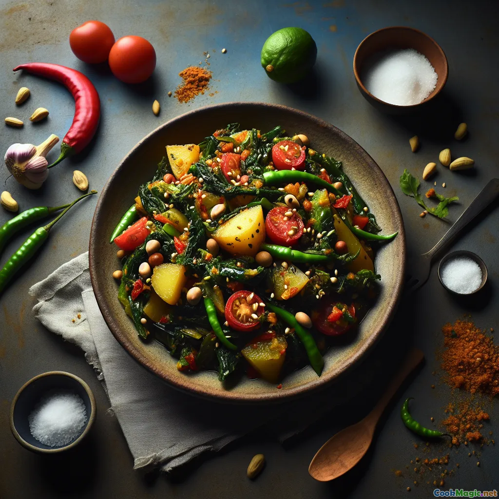Gundruk Achaar Delight celebrates one of Nepal’s most cherished ingredients: gundruk—fermented, sun-dried leafy greens, often mustard or radish leaves. This humble ingredient carries thrilling depth: a tang that hints at lactic fermentation, a minerally savor from the greens themselves, and a satisfyingly chewy bite. When paired with roasted tomatoes, nutty sesame, and the signature bite of mustard oil, the result is a condiment that feels both rustic and remarkably complex.