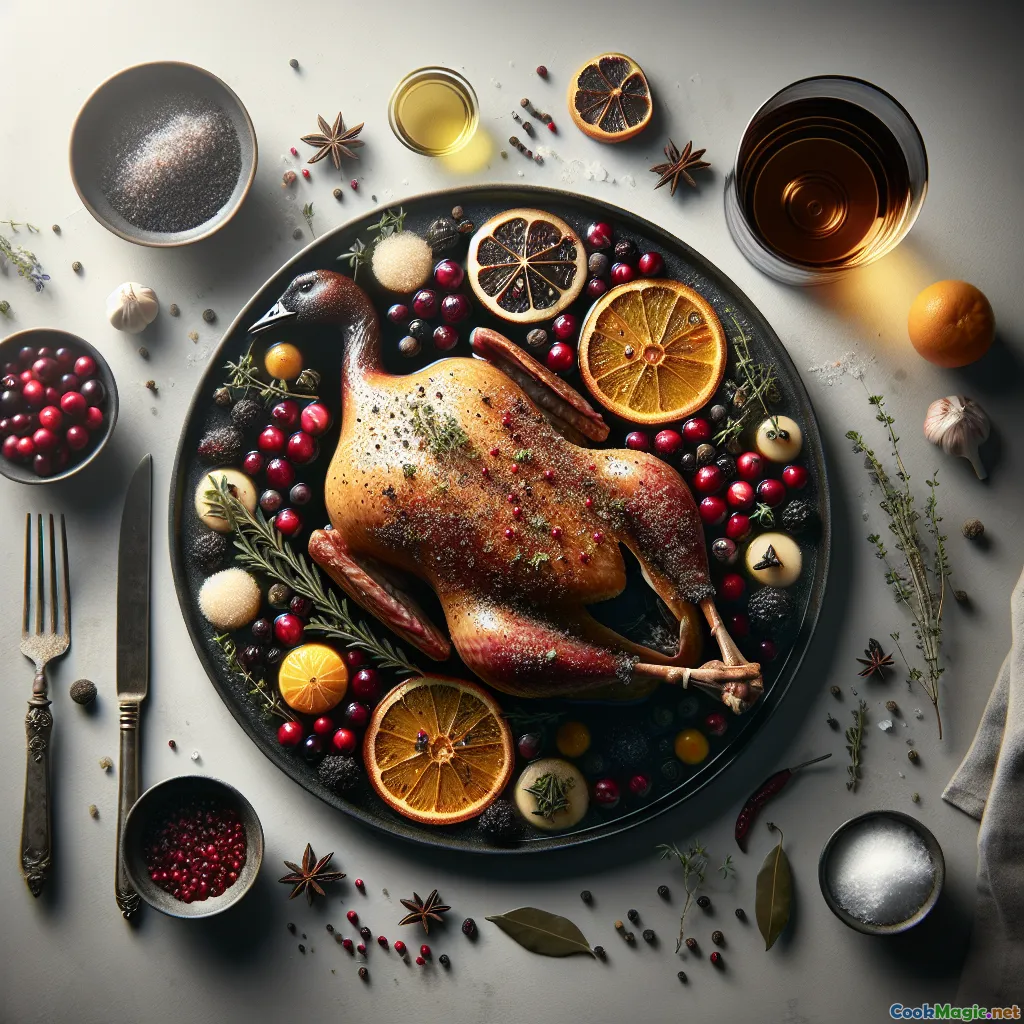 Cured, juniper-scented goose roasted and lacquered with maple-cranberry glaze—a northern, winter-feast centerpiece with sweet-savory depth and aromatic warmth.
