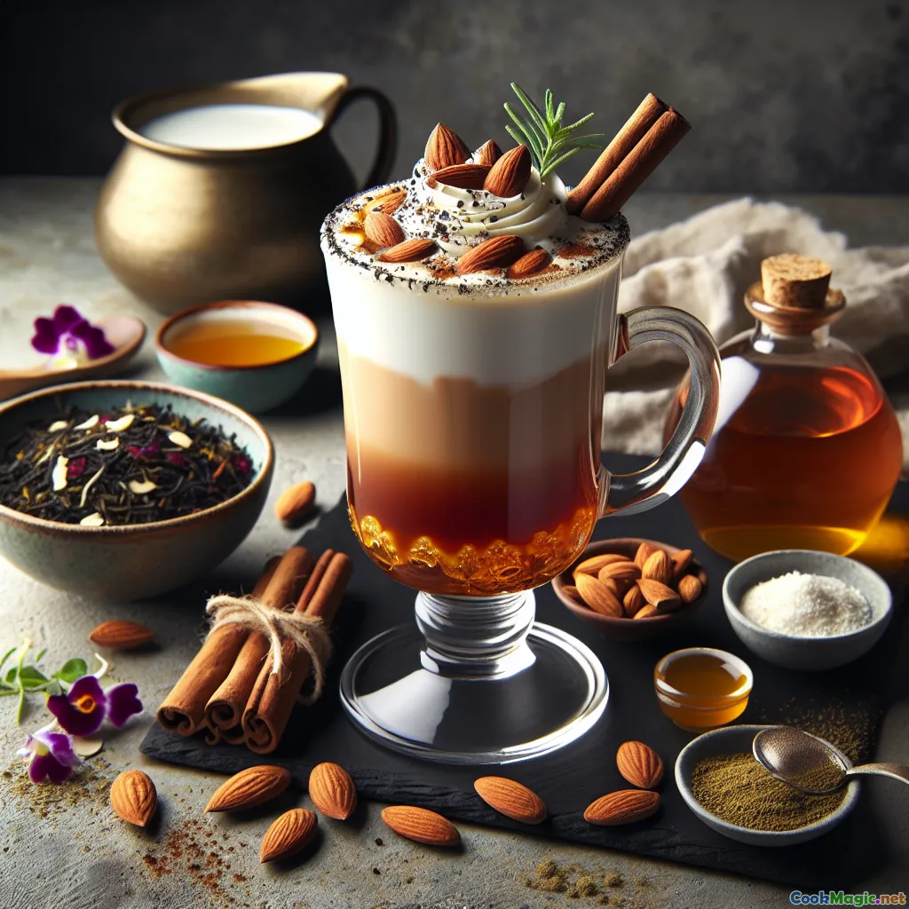 The final flourish: crushed almonds on top, providing an irresistible contrast between the silky liquid and the crunchy nut garnish. This drink stands between a lightly spiced Indian badam doodh and an indulgent English tea latte—a showcase of cultural fusion.