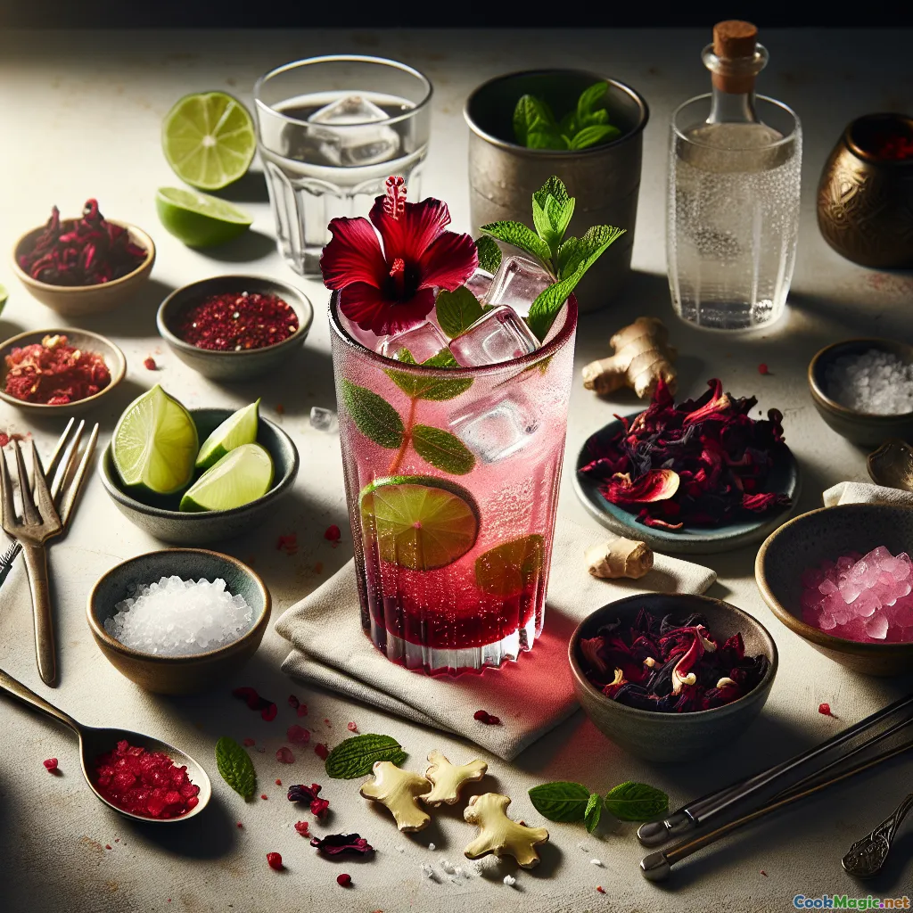 Hibiscus Crimson Reverie is a celebratory ode to hibiscus—known variously as jamaica in Mexico, bissap in West Africa, karkadé in Egypt and Sudan, and sorrel in parts of the Caribbean. This luminous ruby drink pairs the tart, cranberry-like brightness of hibiscus with the zesty lift of lime, the gentle warmth of ginger, and a whisper of rosewater for a beguiling floral finish. Finished with a lively crown of sparkling water and a chili-salt rim, it reads as equal parts refreshing and romantic—perfect for warm afternoons, festive dinners, or any time you want a nonalcoholic drink that feels special. Add a splash of tequila or white rum, and it effortlessly transitions into a captivating cocktail.