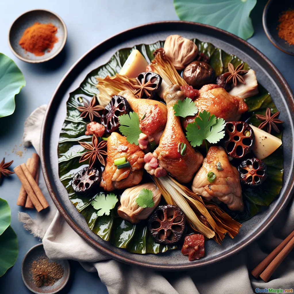 Lotus Leaf Wrapped Fragrant Chicken, or He Ye Ji, is a celebratory Cantonese classic that marries marinated chicken with the haunting perfume of lotus leaves. When the parcel is opened at the table, a plume of aromatic steam announces a dish shaped as much by tradition as by technique. The lotus leaf does more than look beautiful: it traps moisture, infuses gentle tea-like notes, and turns everyday pantry sauces—soy, Shaoxing wine, five-spice—into a complex, rounded bouquet.