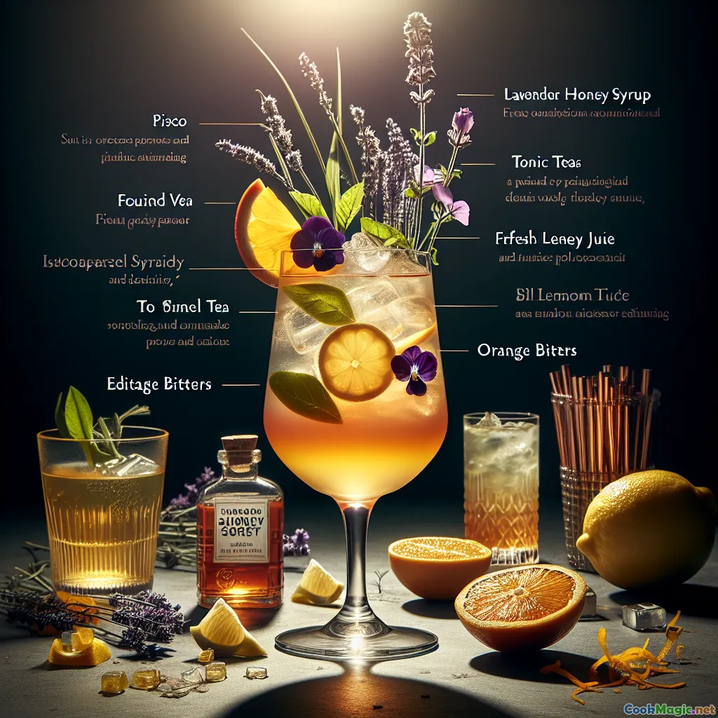 Pisco serves as the backbone, bringing aromatic grapes and a versatile, slightly nutty foundation perfect for both bold/strong and delicate blends. • Lavender-honey syrup balances vocals of ripe honey sweetness and distinctly perfumed lavender flowers, honed in the English country-garden tradition but tailored with global insight. • Earl Grey tea, an icon of British refinement, layers the blend with tannic body and whispers of bergamot oils, acting both as flavor enhancer and a lengthening texture. Instead of clashing, it laces into the mid-palate as silken as the British teas it's derived from. • Lemon juice freshly squeezed for necessary brightness, introduces effervescence that lifts rather than overshadows. • Tonic water—its bubbles and quinine offer the elegant shadow to the sunbeams of flavor, holding bitterness and light in arms.