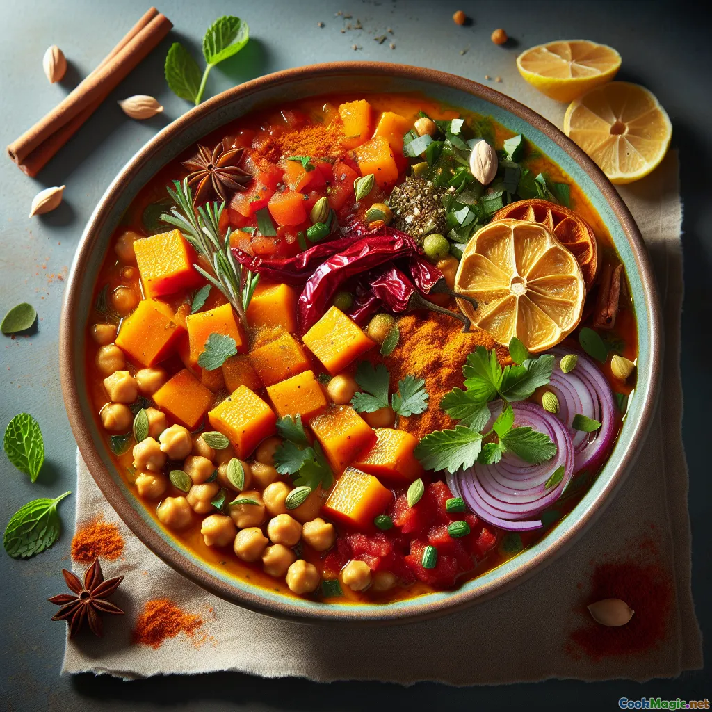 Tafila Spiced Pumpkin Tagine is a warm handshake between Jordan’s rugged highlands and the slow-simmered comfort of a North African tagine. Tafilah (often spelled Tafila) is known for terraced orchards, olive groves, and a cuisine laced with allspice, cinnamon, and the tart sparkle of sumac. This dish borrows the clay-pot method of the Maghreb and applies a Levantine-leaning spice palette, coaxing sweetness from pumpkin while balancing it with lemony brightness and earthy herbs. The result is a deeply aromatic, naturally vegan main that’s bold yet soothing—perfect for cool evenings or festive table spreads.