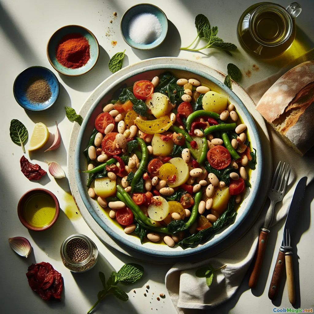 The foundation is classic: sweat onion and garlic until sweet, then bloom tomato paste and spices. This step is essential; darkening the paste concentrates umami and removes raw acidity, while blooming spices in oil unlocks fat-soluble aromatics for a deeper, more integrated flavor. A gentle simmer with crushed tomatoes and stock creates a lush broth. Potatoes, if used, bring body and a traditional comfort; chard or spinach add nutritional color and a soft, earthy counterpoint to the beans. The final touch—fresh mint and lemon juice—provides a clean, herbaceous finish that’s distinctly Tunisian.