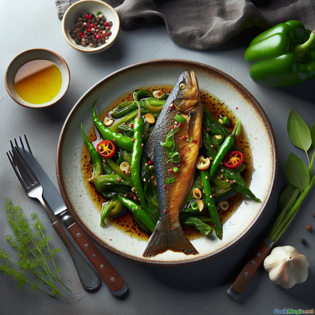 Braised Catfish with Green Pepper and Wild Garlic is built on contrasts: plush, silky fish nestled in a verdant, herbal sauce that balances chili warmth, garlicky perfume, and a gentle tang. Catfish is ideal for braising—its firm, fatty flesh remains succulent and resists flaking apart, while the skin enriches the broth with gelatin. Green peppers bring grassy aroma and brightness without overpowering heat, and wild garlic (also known as ramsons) supplies a springlike, woodsy note that lands somewhere between garlic and chive.