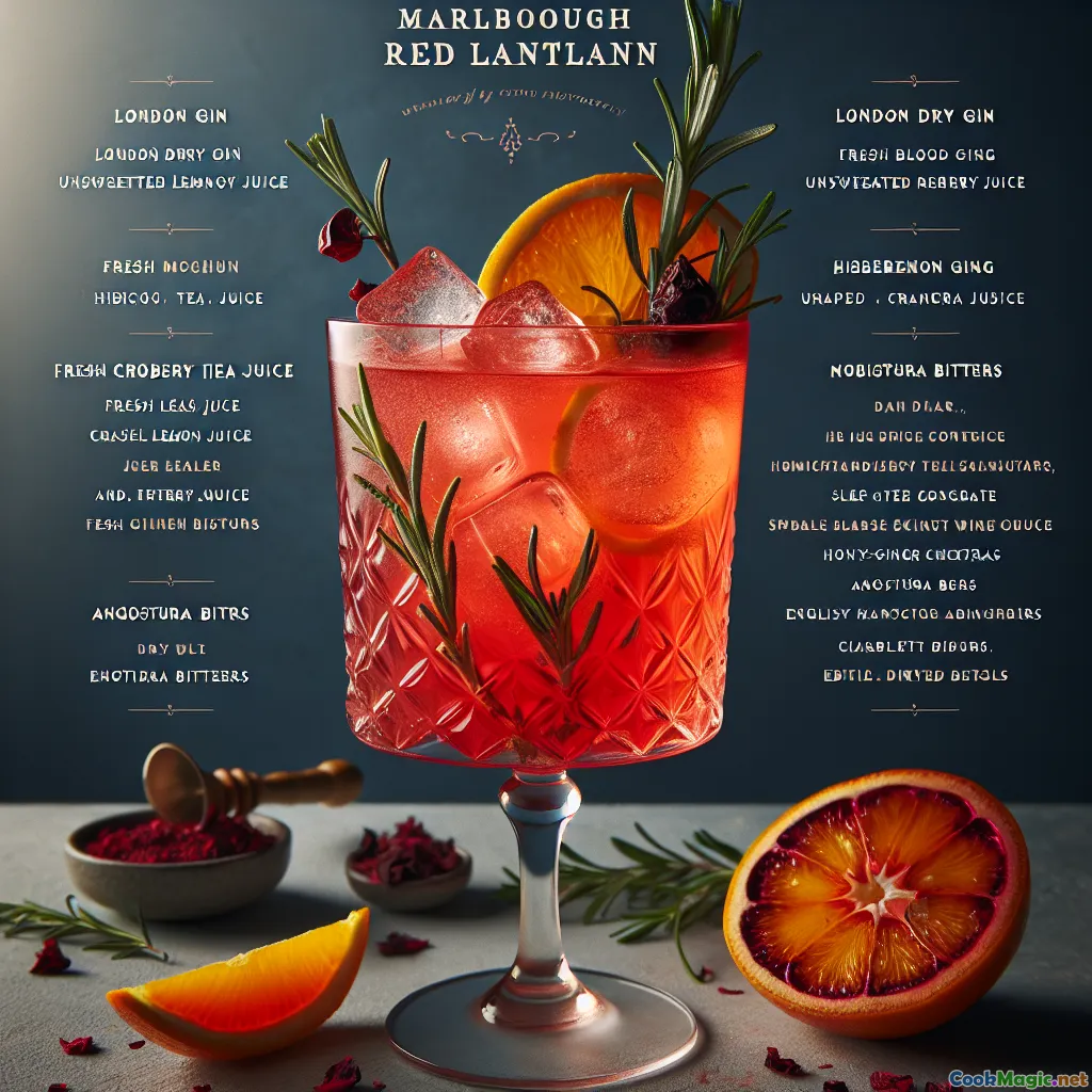 The Marlborough Red Lantern is a distinctly English cocktail with a cosmopolitan wink. It marries the hedgerow charm of sloe gin with the urbane precision of London Dry gin, then paints the glass a luminous crimson using hibiscus and cranberry. A final lift of English sparkling wine brings finesse—tiny, persistent bubbles that carry citrus and herb aromas with theatrical flair. The name nods to London’s storied Marlborough lineage and the lantern-lit alleys of Soho and Chinatown, where red lanterns symbolize luck, festivity, and gathering.