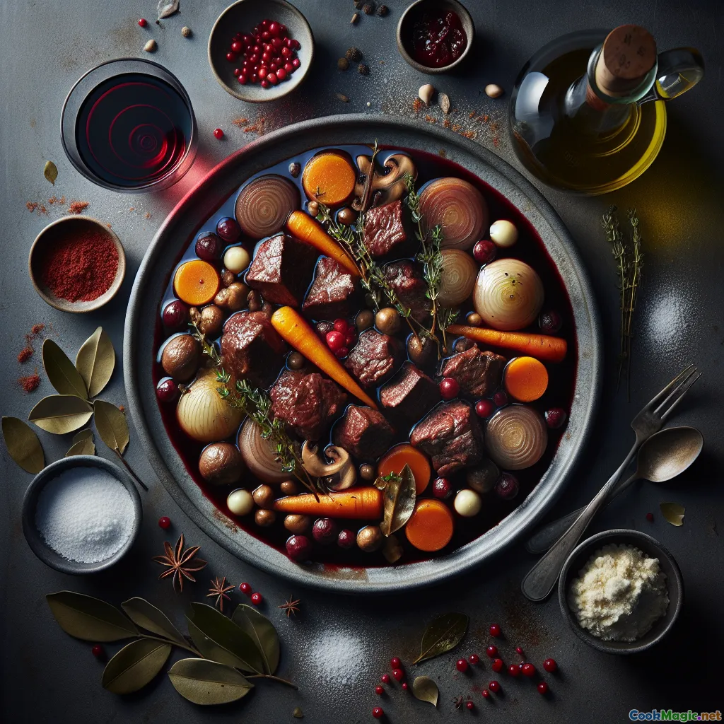 Burgundy Game Stew in Red Wine pays homage to the French tradition of slow-braising robust meats in Pinot Noir, a hallmark of the Burgundy region. Imagine the velvet embrace of a glossy sauce infused with juniper, thyme, and bay; the sweetness of pearl onions and carrots; the woodland savor of mushrooms; and the smoky undertone of bacon—all wrapped around tender cubes of venison. It is a dish that warms from the inside out and tastes even better on day two.