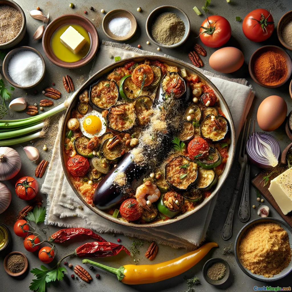 This savory, comforting casserole borrows its soul from the French Quarter, weaving the famed New Orleans trinity of onion, celery, and bell pepper with plush roasted eggplant, tomatoes, and a crackling pecan–panko crown. It is the kind of dish you carry to a courtyard table as jazz hums in the distance, equally at home on a Sunday gathering table or a weeknight when you crave a hug of warmth and spice.